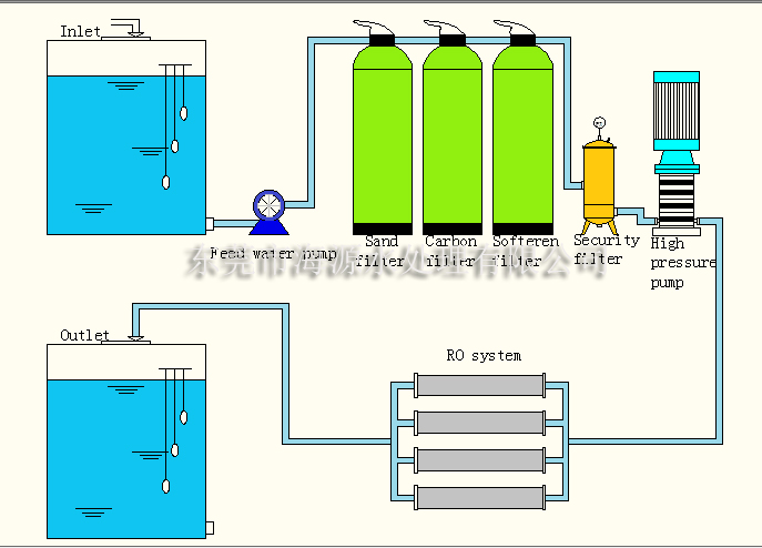工藝流程:源水箱--給水泵――多介質/砂過濾器―――碳過濾器―――軟水器/阻加藥――保安過濾器――高壓泵――-反滲透系統(tǒng)――產品水箱/滲透水箱