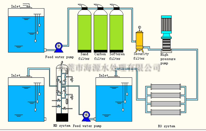 Source water tank →Feed water pump → muti- media filter → active carbon filter → water softener(or inhibitor dosing)→PP filter→high-pressure pump →RO system→RO purified tank→Mix bed feed water pump →Ion exchange mix bed →filter→Purified water