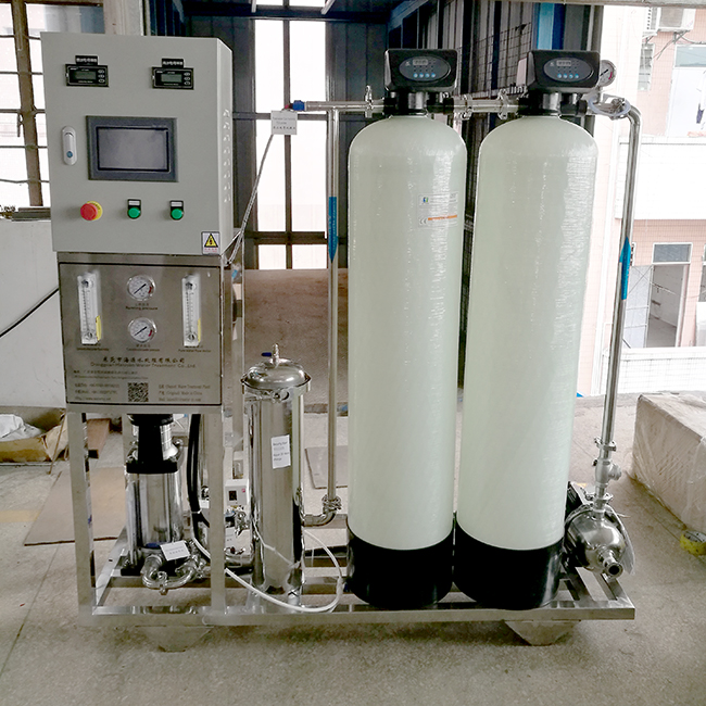 原水經(jīng)由原水箱及原水增壓系統(tǒng)進入全自動石英砂過濾器、全自動活性碳過濾器、過濾去除原水中的大顆粒雜質(zhì)、懸浮物、膠體、有機物、余氯等。經(jīng)過預處理設備后的產(chǎn)水,進入反滲透主機,經(jīng)高壓系統(tǒng)增壓后進入反滲透膜過濾系統(tǒng),對自來水進行深度處理,將水中有害雜質(zhì)全部去除,達到深度凈化的目的。