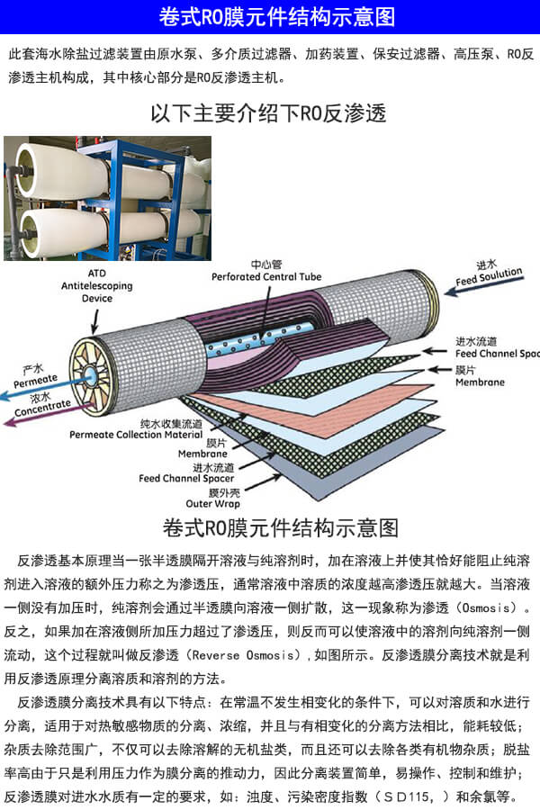 反滲透裝置主要包括多級高壓泵、反滲透膜元件、膜殼(壓力容器)、支架等組成。其主要作用是去除水中的雜質,使出水滿足使用要求。海水淡化系統(tǒng)。