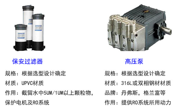 預(yù)處理系統(tǒng)一般包括原水泵、加藥裝置、石英砂過濾器、活性炭過濾器、精密過濾器等。其主要作用是降低原水的污染指數(shù)和余氯等其他雜質(zhì),達(dá)到反滲透的進(jìn)水要求。預(yù)處理系統(tǒng)的設(shè)備配置應(yīng)該根據(jù)原水的具體情況而定。