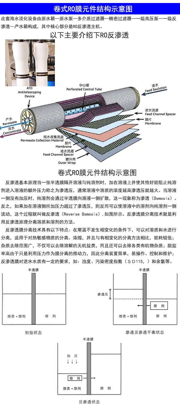 反滲透裝置主要包括多級(jí)高壓泵、反滲透膜元件、膜殼(壓力容器)、支架等組成。其主要作用是去除水中的雜質(zhì),使出水滿足使用要求。海水淡化系統(tǒng)。